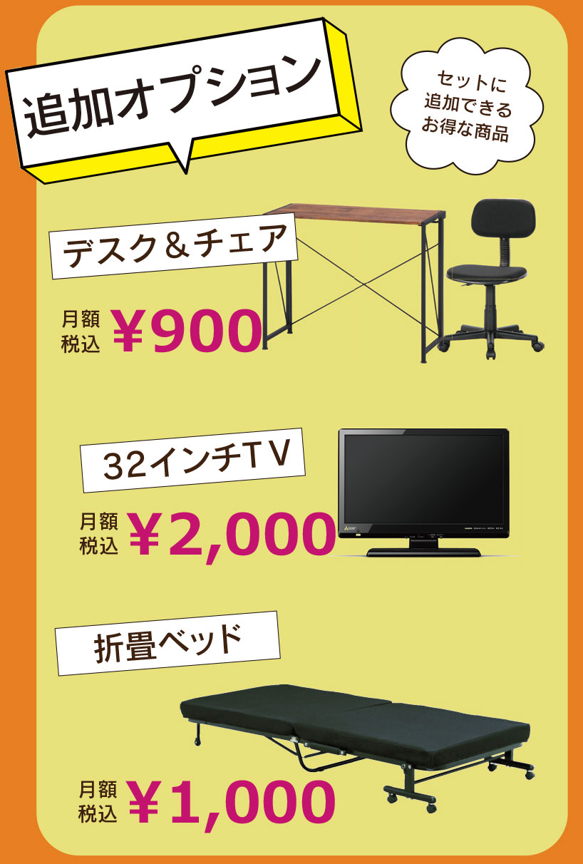 オプションで液晶テレビ、ベッド、デスク&チェアを追加したり、折畳ベッドをスプリングベッドに変更する事も可能です。