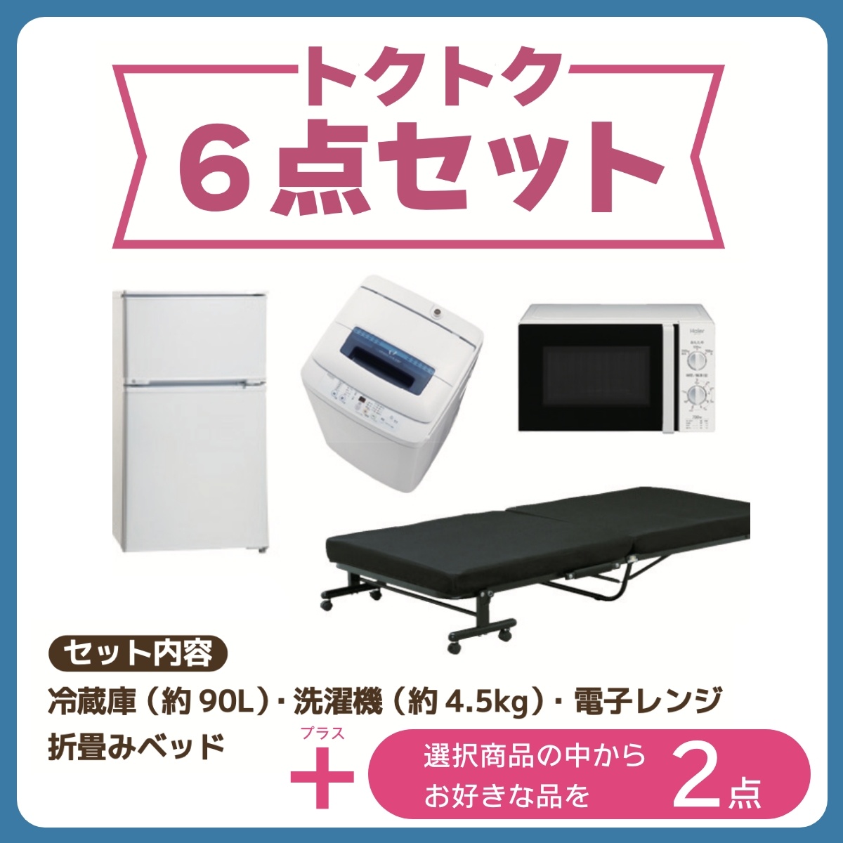 「冷蔵庫(約90L)」+「洗濯機(4.5kg)」+「電子レンジ」+「折畳みベッド」の”4点”と、