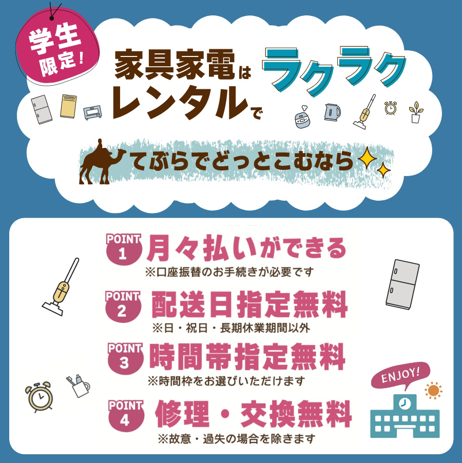 「冷蔵庫(約90L)」+「洗濯機(4.5kg)」+「電子レンジ」の”3点”と、「炊飯器(5.5 合炊)」「照明器具(~6畳用)」「電気ケトル(約 1L)」「ドレッサー」「カーテンセット」「スティック掃除機(サイクロン式)」「折脚ローテーブル」「こたつ(布団はつきません)」「コードレススチームアイロン&台」「ローボード(小)」「チェスト」の11点の中から”3点”選べる合計6点セットです。